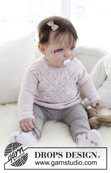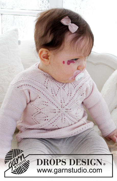 Strikket firkantbluse med hulmønster til baby. Størrelse 1 mdr – 4 år. Arbejdet er strikket i DROPS Baby Merino