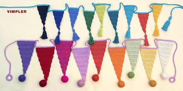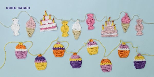 Originale opskrifter på hæklede ranker og guirlander med babypynt, kager, is og bolsjer, nationalflag, vimpler og bolde.
