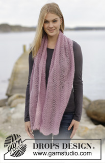 Sættet består af: Strikket DROPS stola i 1 tråd ”DROPS Kid-Silk” med bølgemønster og hue i 2 tråde ”Kid-Silk” med retstrik.