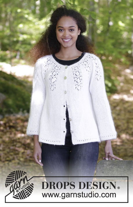 Jakke med rundt bærestykke, hulmønster og A-facon, strikket ovenfra og ned. Størrelse S - XXXL. Arbejdet er strikket i DROPS Baby Merino og DROPS Kid-Silk.