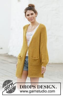 Strikket lang jakke med ballonærmer og raglan i DROPS Sky. Arbejdet strikkes ovenfra og ned med V-hals, lommer og slids i siden. Størrelse S - XXXL.